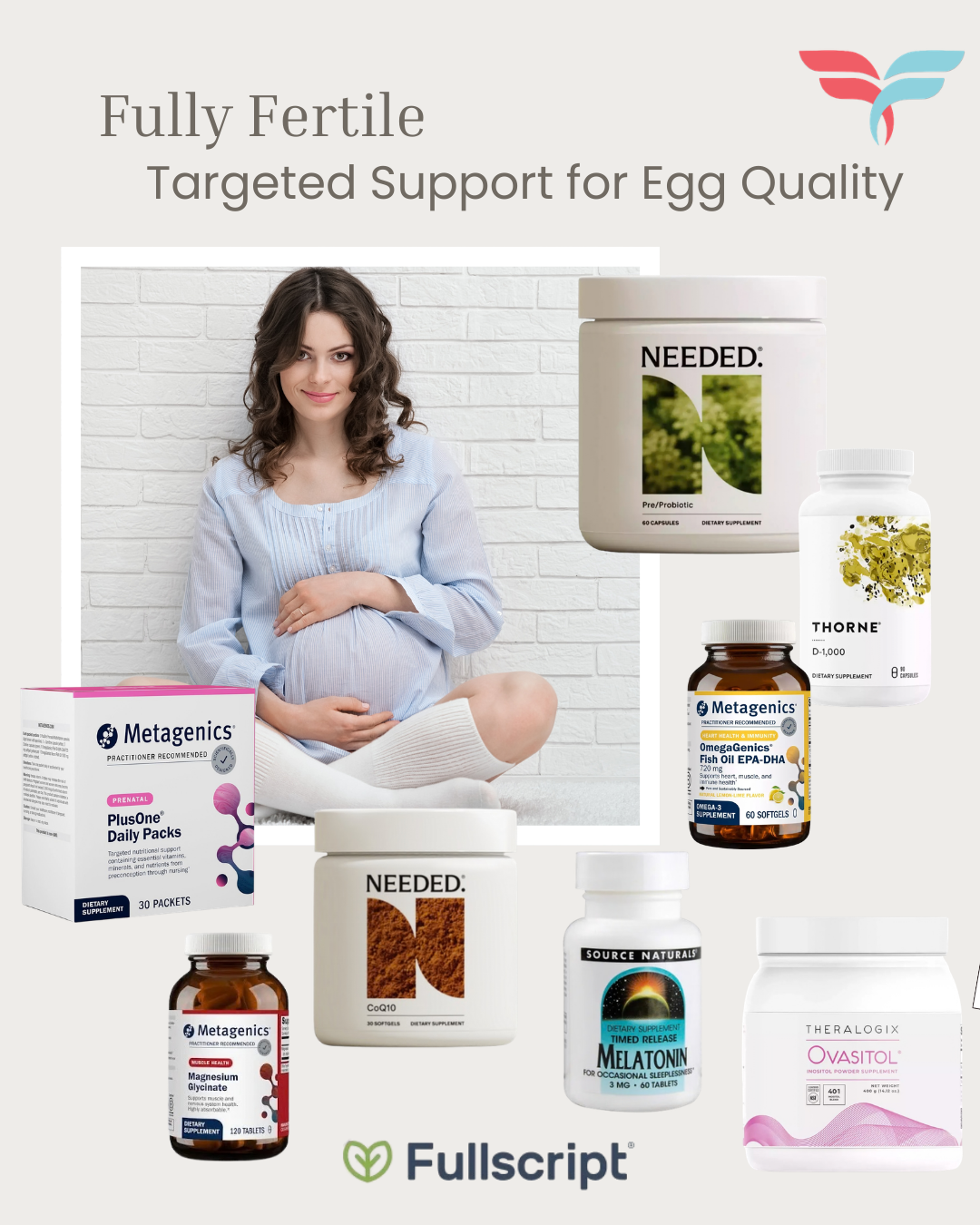 It takes roughly 90 days for an egg to mature. Make the most of this time by incorporating our "great eight" into your daily routine. Includes: PlusOne™ Daily Prenatal Packs (Metagenics); D-1000 (Thorne); Prenatal Pre/Probiotic capsules (Needed); Ovasitol® Inositol Powder (Theralogix); OmegaGenics® EPA-DHA 720 Fish Oil (Metagenics); Melatonin (Source Natruals); CoQ10 (Needed); Magnesium Glycinate (Metagenics).