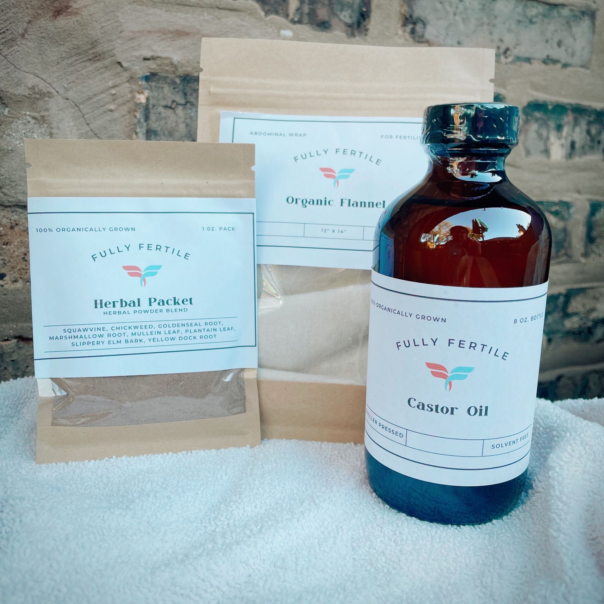 Castor oil abdominal wraps are a traditional tool used for many years to support fertility & women's health. Our specialized kit can help to detoxify your reproductive organs & tonify blood cells. Includes: 8oz glass bottle of 100% organically grown Castor oil, 1pc 12" x 14" reusable organic flannel wrap, and 1oz herbal powder (a blend of 100% organically grown squawvine, chickweed, goldenseal root, marshmallow root, mullein leaf, plantain leaf, slippery elm bark, & yellow dock root).